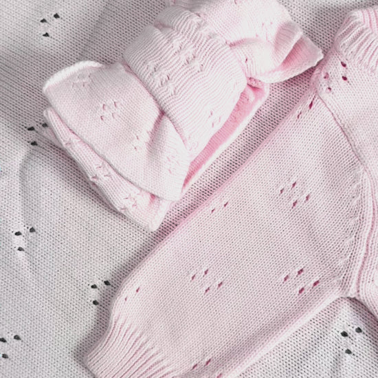 - Bundle includes pink rosélle frill leg romper, blanket, booties & headband
